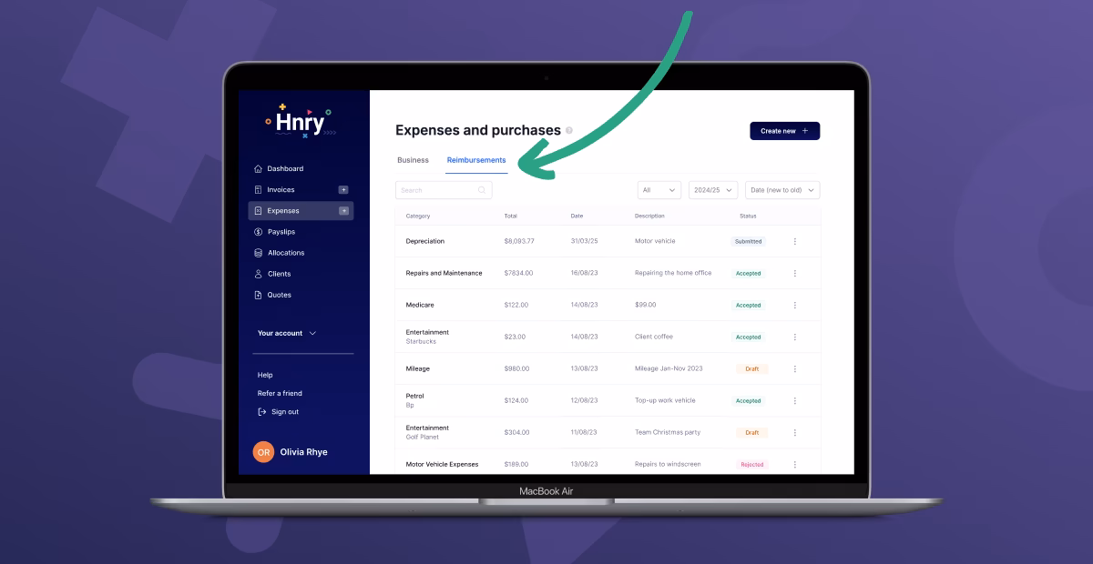 Your Hnry Dashboard gives you a quick overview of your current outstanding invoices, as well as all your recent payments. You can also keep track of your income and your expenses claimed for the financial year.