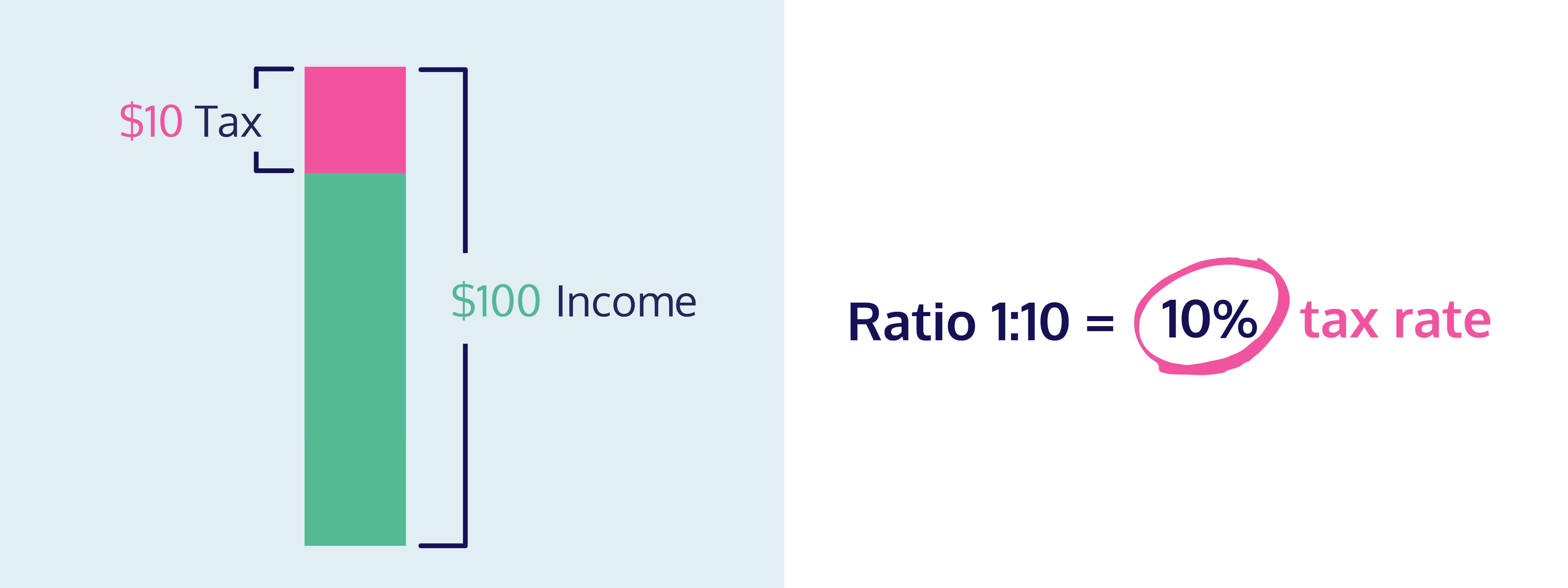 For example, if you had $100 of taxable income, and paid $10 of that in tax, the ratio between income and tax would be 10:100, simplified to 1:10. This ratio in percentage form is 10% – the tax rate.