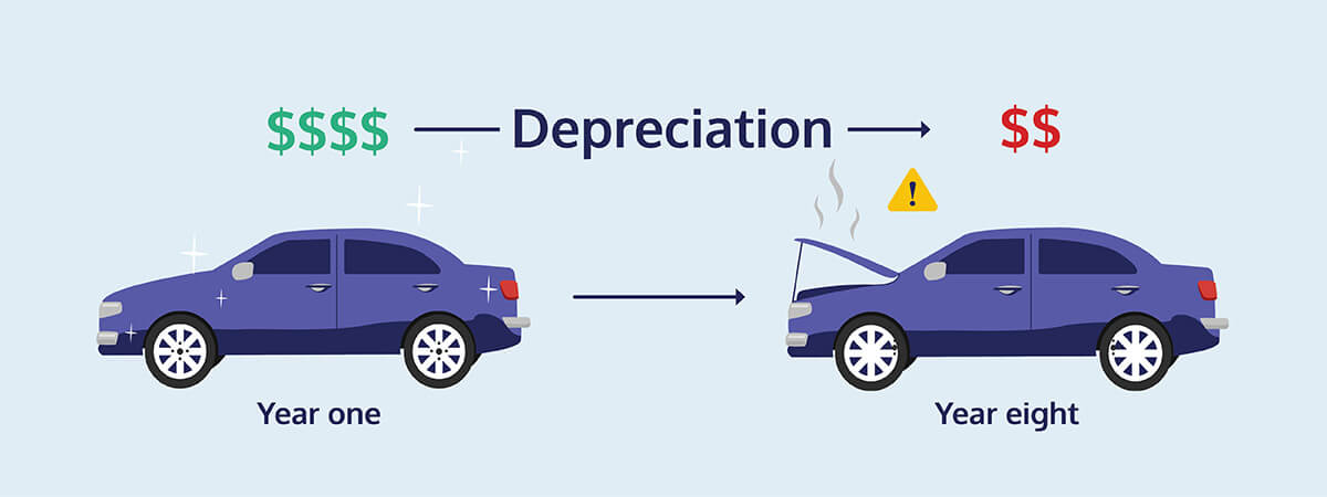 Depreciation is the reduction in value of an asset over its effective life, usually due to wear and tear. For example, if you buy a brand-new car for $40k and then use it for a few years before selling it, it will usually only be worth a chunk of what you originally paid for it. This drop in price is the depreciation.