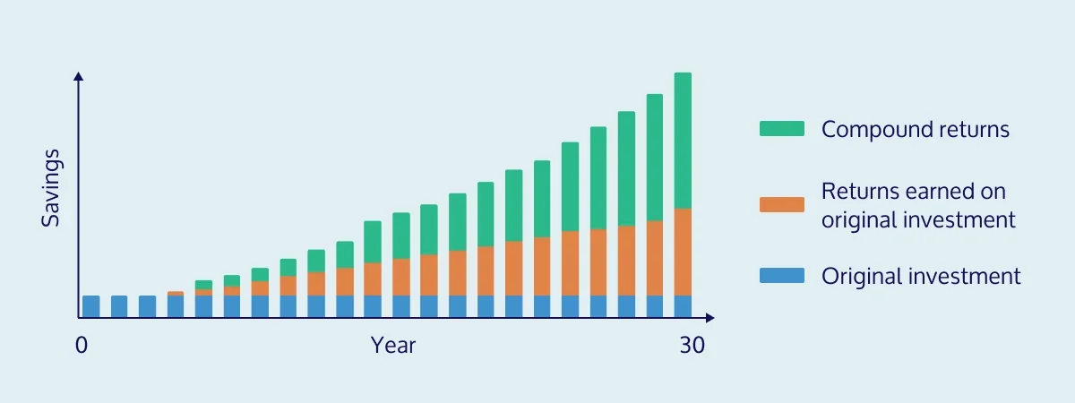 Basically, when you invest in a Super fund, you’ll ideally earn returns on the money you invest (there are no guarantees!). The returns are then added to the capital to be reinvested, allowing both to generate further returns.